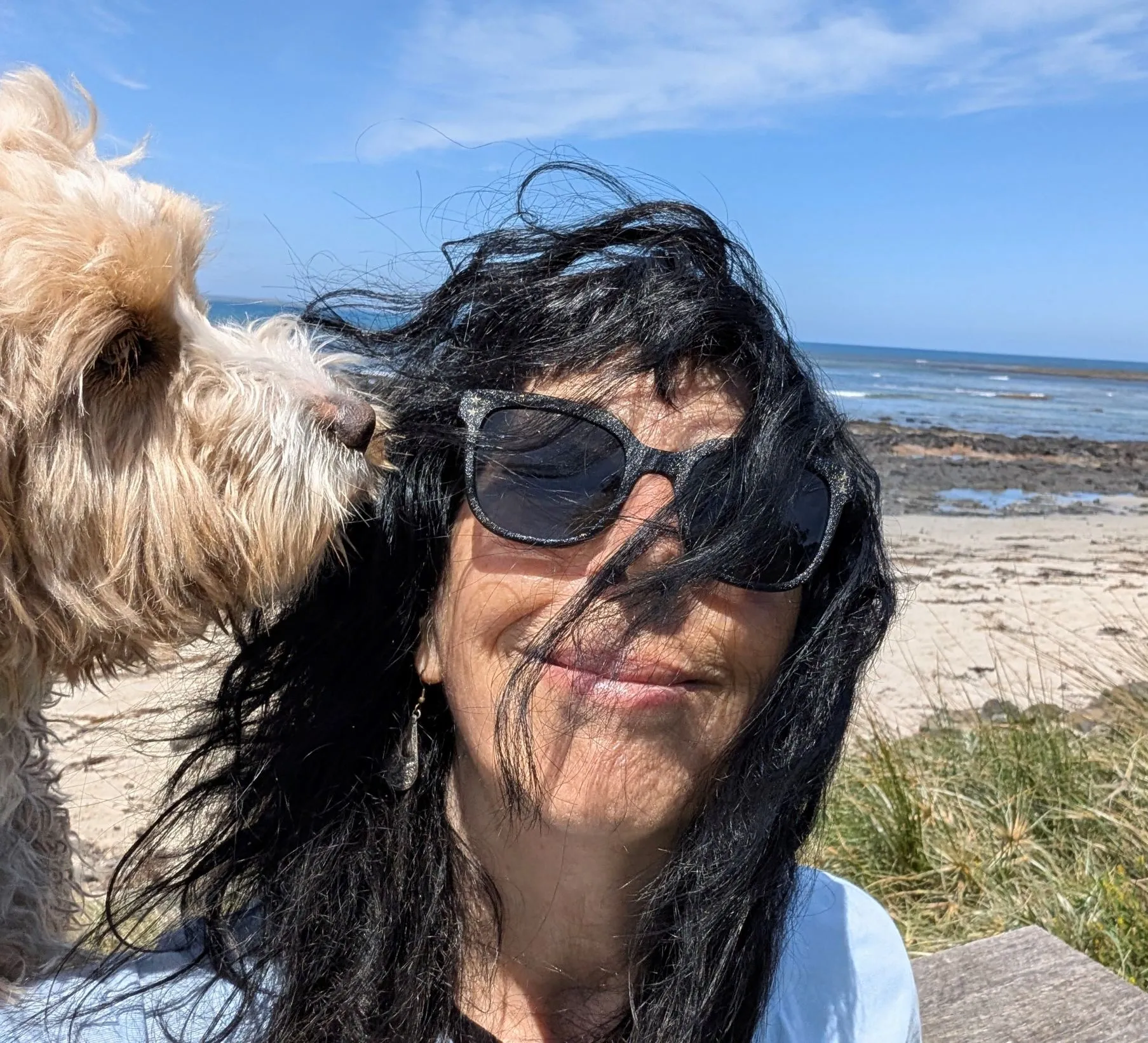 Happiness. According to my Groodle Misha, it’s: Playing – with a friend. Hanging out – with best mates and a willing treat-dispenser. Going for walks – with a neighbour. Rolling in a hole she’s dug – with a fellow Groodle. And being at the beach – with her bestie. See video for illustration on my…